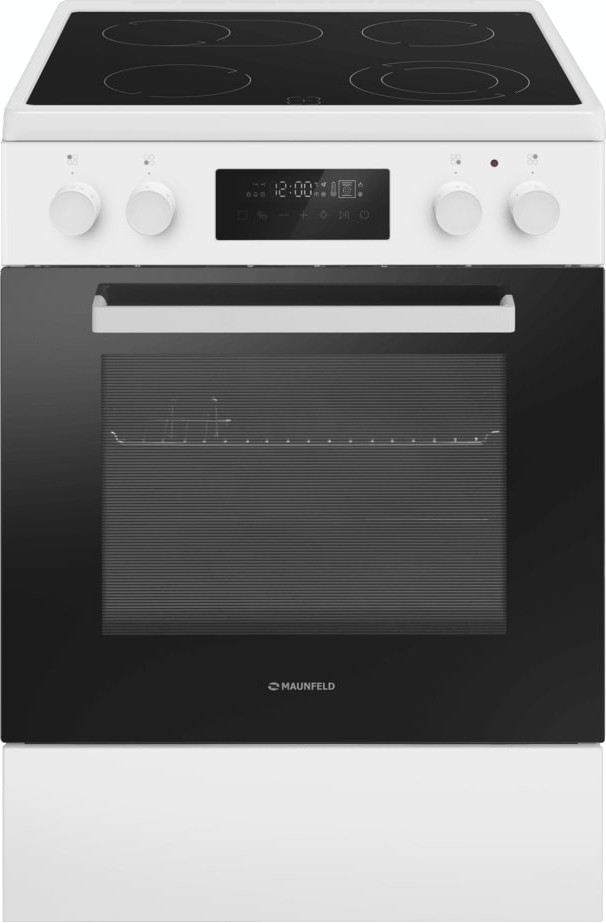 Электрическая плита Maunfeld MEC611CW09TD — отличный выбор как для квартиры, так и для частного дома. Цвет корпуса белый, он гармонично сочетается с мебелью и техникой похожих оттенков, а также может интересно выглядеть на контрасте с ними. На внутренней поверхности двери расположена таблица доступных рецептов — полезная и необычная фишка. Для управления используется удобная и понятная электронная система. Благодаря ей выбирать режимы приготовления и настраивать параметры температуры очень просто. Основная информация о процессе отображается на дисплее. Переключатели не только выполняют техническую функцию, но и поддерживают общий дизайн; тип элементов: сенсорные + поворотные.