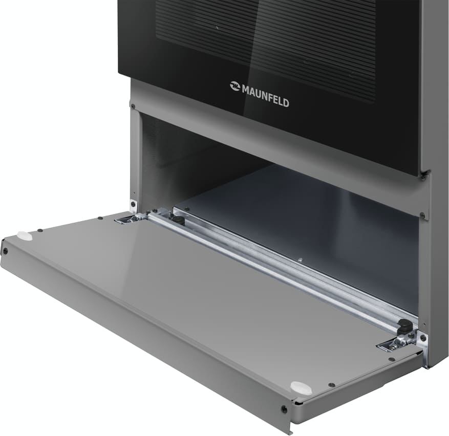 Внутренняя поверхность имеет специальное защитное покрытие: эмаль хорошо аккумулирует и держит тепло, не нуждается в специфическом уходе. Следуйте инструкции для удаления загрязнений — и прибор прослужит вам много лет без повреждений. Отдельный газ-контроль для камеры дополнительно гарантирует безопасность использования. Продуманная система направляющих для противней предупреждает падение тяжелой посуды при ее загрузке и извлечении: в этой модели используются рельефные элементы. Приятный бонус — специальное отделение для хранения посуды и аксессуаров.
