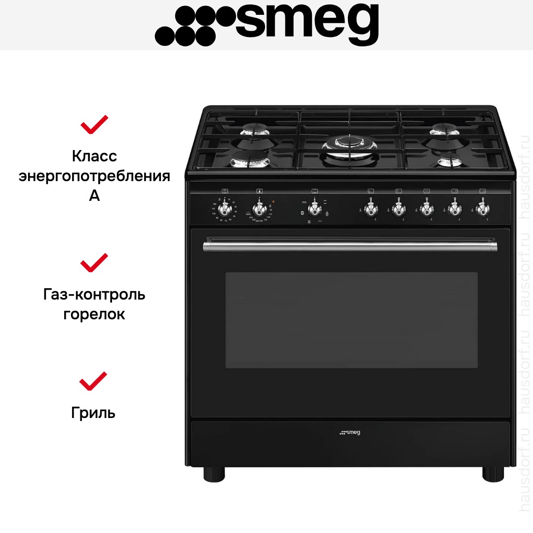 Комбинированная плита Smeg CX91GMBL — отличный выбор как для квартиры, так и для частного дома. Цвет корпуса черный, он гармонично сочетается с мебелью и техникой похожих оттенков, а также может интересно выглядеть на контрасте с ними. Для управления используется удобная и понятная механическая система. Благодаря ей выбирать режимы приготовления и настраивать параметры температуры очень просто. Переключатели не только выполняют техническую функцию, но и поддерживают общий дизайн; тип элементов: поворотные.