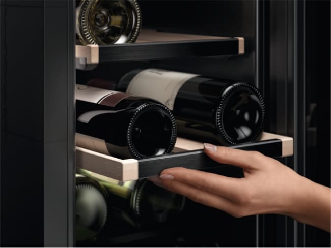 Полки в винных шкафах позволяют размещать бутылки для хранения в горизонтальном положении. Это необходимо, чтобы пробка постоянно смачивалась жидкостью и не пересыхала. Плотно закрытая пробка гарантирует, что внутрь бутылки не проникнет наружный воздух. Кислород, содержащийся в воздухе, может стать причиной ухудшения вкуса вина и даже его скисания. Кроме того, горизонтальное положение позволяет лучше оценить количество осадка. Материал изготовления полок выбирается, исходя из требований, предъявляемых к содержанию коллекции вин. Одним из основных требования является отсутствие или максимальное сокращение вибрации и хорошая фиксация бутылок на месте хранения. Даже если полка выдвигается, бутылки должны оставаться на своем месте. Второе требование исключает применение стеклянных полок, как в обычном холодильнике: на них почти невозможно зафиксировать бутылки.