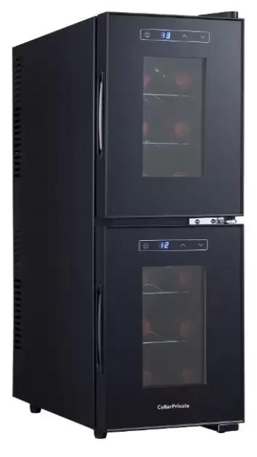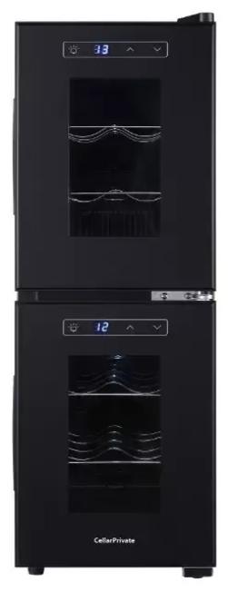 Винный холодильник CellarPrivate CP012-2E имеет две температурные зоны, в которых одновременно можно хранить разные сорта алкоголя и выставлять разные сочетания настроек. Он устанавливается отдельно, что удобно, если у вас есть специальное помещение — кладовая, погреб и т.д. Благодаря компактным размерам данная модель — отличный выбор для офиса, гостиничного номера. Количество бутылок, которое можно разместить с учетом полной комплектации и из расчета объема бутылки 0,75 л, — 12 шт.