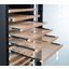 Полки в винных шкафах позволяют размещать бутылки для хранения в горизонтальном положении. Это необходимо, чтобы пробка постоянно смачивалась жидкостью и не пересыхала. Плотно закрытая пробка гарантирует, что внутрь бутылки не проникнет наружный воздух. Кислород, содержащийся в воздухе, может стать причиной ухудшения вкуса вина и даже его скисания. Кроме того, горизонтальное положение позволяет лучше оценить количество осадка. Материал изготовления полок выбирается, исходя из требований, предъявляемых к содержанию коллекции вин. Одним из основных требования является отсутствие или максимальное сокращение вибрации и хорошая фиксация бутылок на месте хранения. Даже если полка выдвигается, бутылки должны оставаться на своем месте. Второе требование исключает применение стеклянных полок, как в обычном холодильнике: на них почти невозможно зафиксировать бутылки.