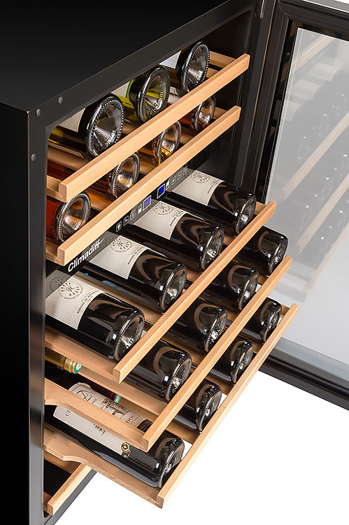 Полки в винных шкафах позволяют размещать бутылки для хранения в горизонтальном положении. Это необходимо, чтобы пробка постоянно смачивалась жидкостью и не пересыхала. Плотно закрытая пробка гарантирует, что внутрь бутылки не проникнет наружный воздух. Кислород, содержащийся в воздухе, может стать причиной ухудшения вкуса вина и даже его скисания. Кроме того, горизонтальное положение позволяет лучше оценить количество осадка. Материал изготовления полок выбирается, исходя из требований, предъявляемых к содержанию коллекции вин. Одним из основных требования является отсутствие или максимальное сокращение вибрации и хорошая фиксация бутылок на месте хранения. Даже если полка выдвигается, бутылки должны оставаться на своем месте. Второе требование исключает применение стеклянных полок, как в обычном холодильнике: на них почти невозможно зафиксировать бутылки.