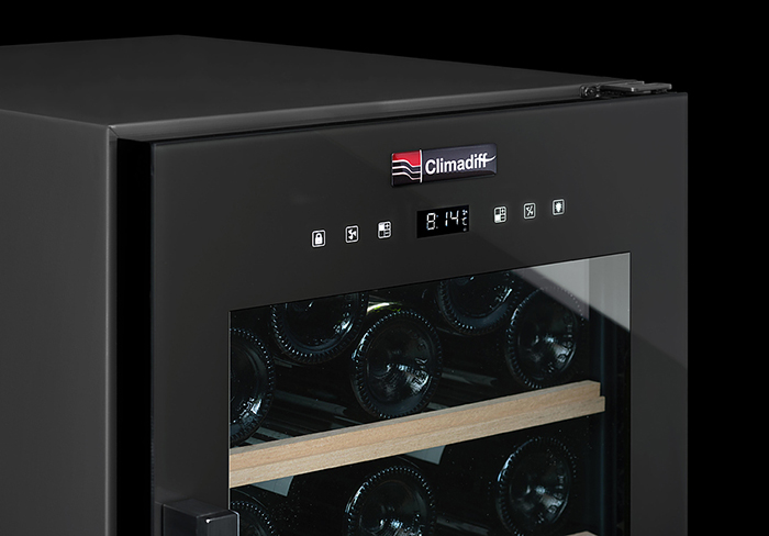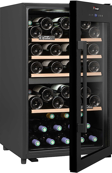 Стеклянная дверь — дополнительный изящный штрих к общему дизайну модели. Специальное покрытие защищает вино от влияния ультрафиолетовых лучей, которые проникают, если шкаф находится в солнечной комнате. Цвет корпуса — черный.