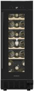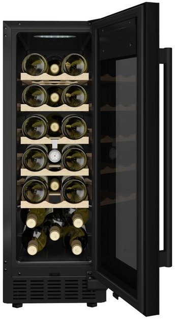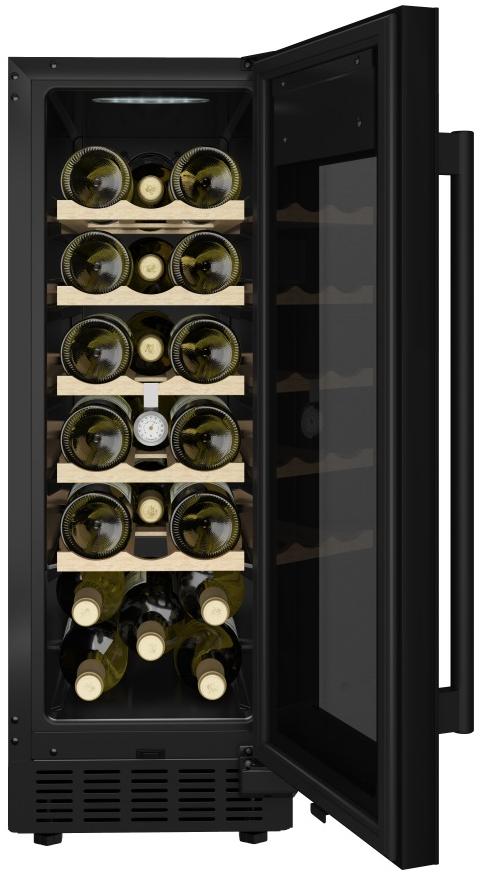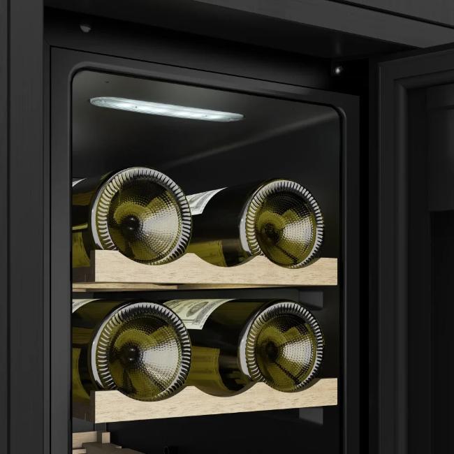 Стеклянная дверь — дополнительный изящный штрих к общему дизайну модели. Специальное покрытие защищает вино от влияния ультрафиолетовых лучей, которые проникают, если шкаф находится в солнечной комнате. Цвет корпуса — черный.