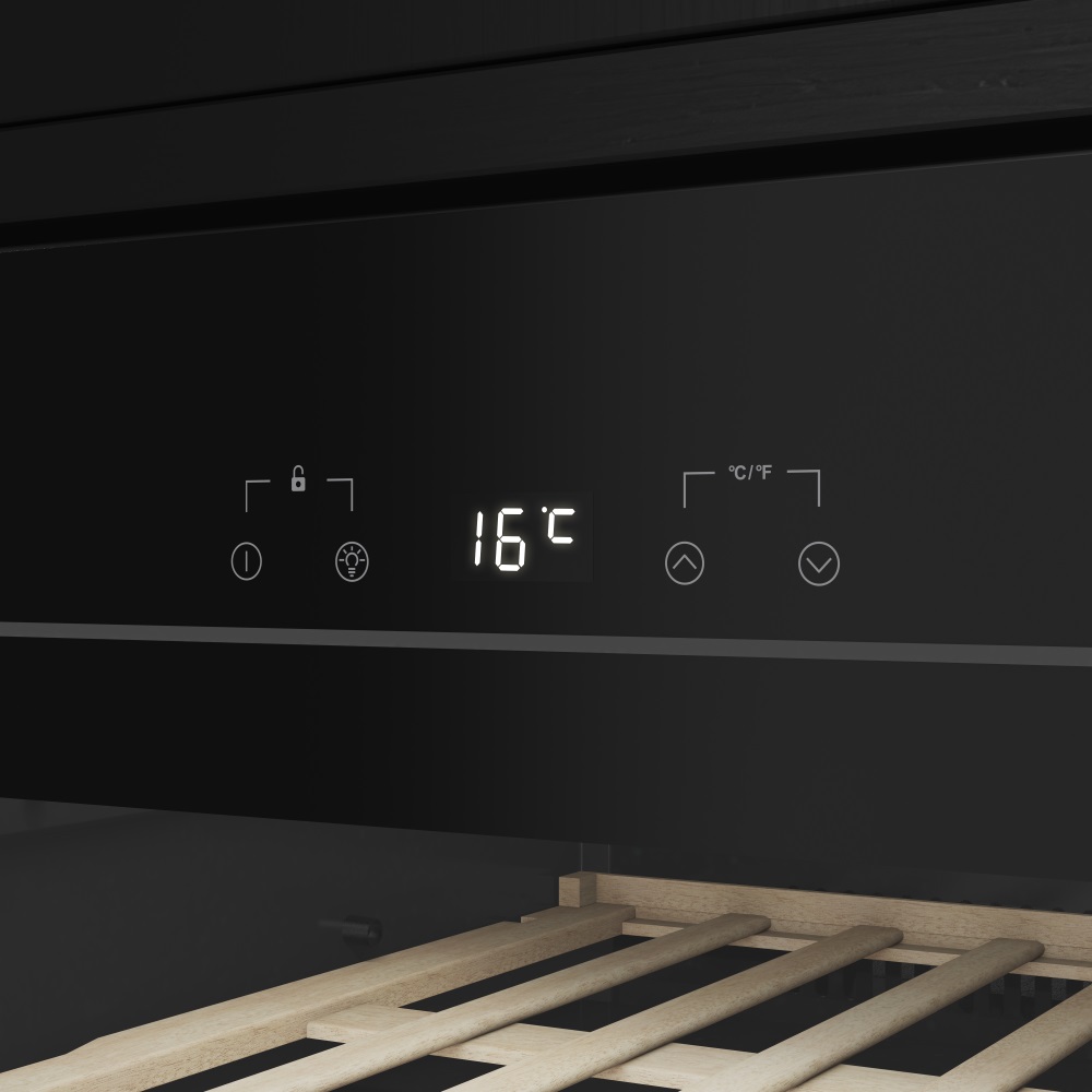Большинство современных винных шкафов имеет электронное управление, они могут оснащаться обычными цифровыми дисплеями, на которых будет отображаться минимум информации — о включении, температуре в камере и возникших неисправностях. Однако в большинстве моделей используются текстовые сенсорные дисплеи из нескольких сегментов. С помощью кнопок сенсорного меню на этих дисплеях можно отображать и регулировать температуру в каждой зоне отдельно с точностью до градуса, выбирать уровень влажности, задавать дополнительные опции — отключение сигнализации, включение вентиляции и внутреннего освещения, активацию защиты от детей, тип отображения температуры ºF/ºC. Здесь же будут появляться коды ошибок, выданные системой обнаружения неисправностей.