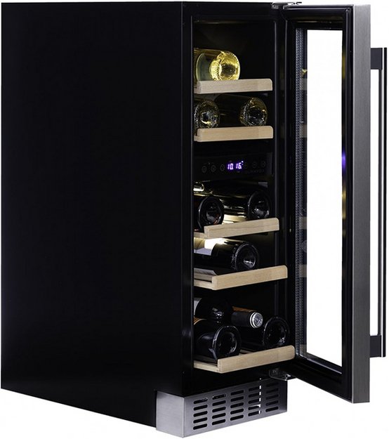 Электронное управление помогает быстро разобраться в том, как функционирует эта модель, и легко настроить все необходимые параметры. На дисплее отображаются данные, которые собирают датчики в камере. Лампочки, расположенные внутри, хорошо подсвечивают бутылки. Всего полок, на которых можно разместить коллекцию, в шкафу 4 шт.