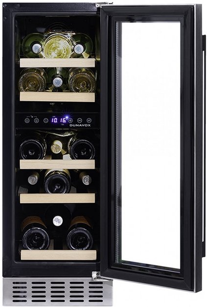 Винный холодильник Dunavox DAUF-17.58DMB имеет две температурные зоны, в которых одновременно можно хранить разные сорта алкоголя и выставлять разные сочетания настроек. Он встраивается в нишу, что удобно, если у вас ограничен метраж помещения. Благодаря компактным размерам данная модель — отличный выбор для офиса, гостиничного номера. Количество бутылок, которое можно разместить с учетом полной комплектации и из расчета объема бутылки 0,75 л, — 17 шт.