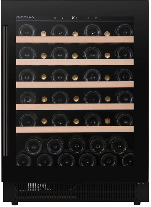 Стеклянная дверь — дополнительный изящный штрих к общему дизайну модели. Специальное покрытие защищает вино от влияния ультрафиолетовых лучей, которые проникают, если шкаф находится в солнечной комнате. Хранение становится еще безопаснее и герметичнее благодаря нескольким слоям стекол. Цвет корпуса — черный матовый. Дверь можно перевесить на другую сторону, поэтому вариантов размещения его в доме становится больше.
