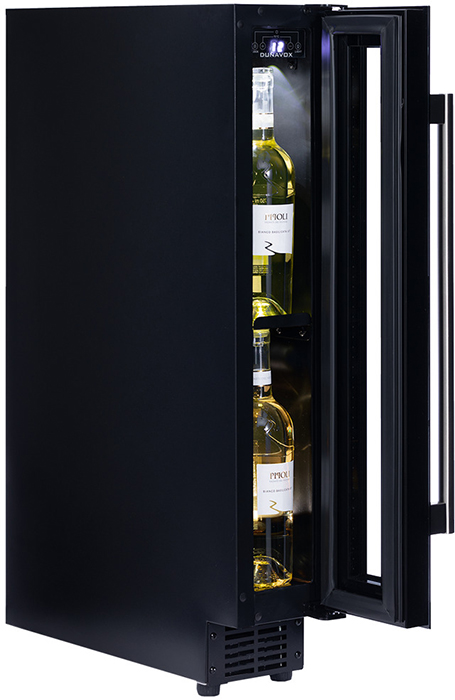 Стеклянная дверь — дополнительный изящный штрих к общему дизайну модели. Специальное покрытие защищает вино от влияния ультрафиолетовых лучей, которые проникают, если шкаф находится в солнечной комнате. Хранение становится еще безопаснее и герметичнее благодаря нескольким слоям стекол. Цвет корпуса — черный матовый. Дверь можно перевесить на другую сторону, поэтому вариантов размещения его в доме становится больше.