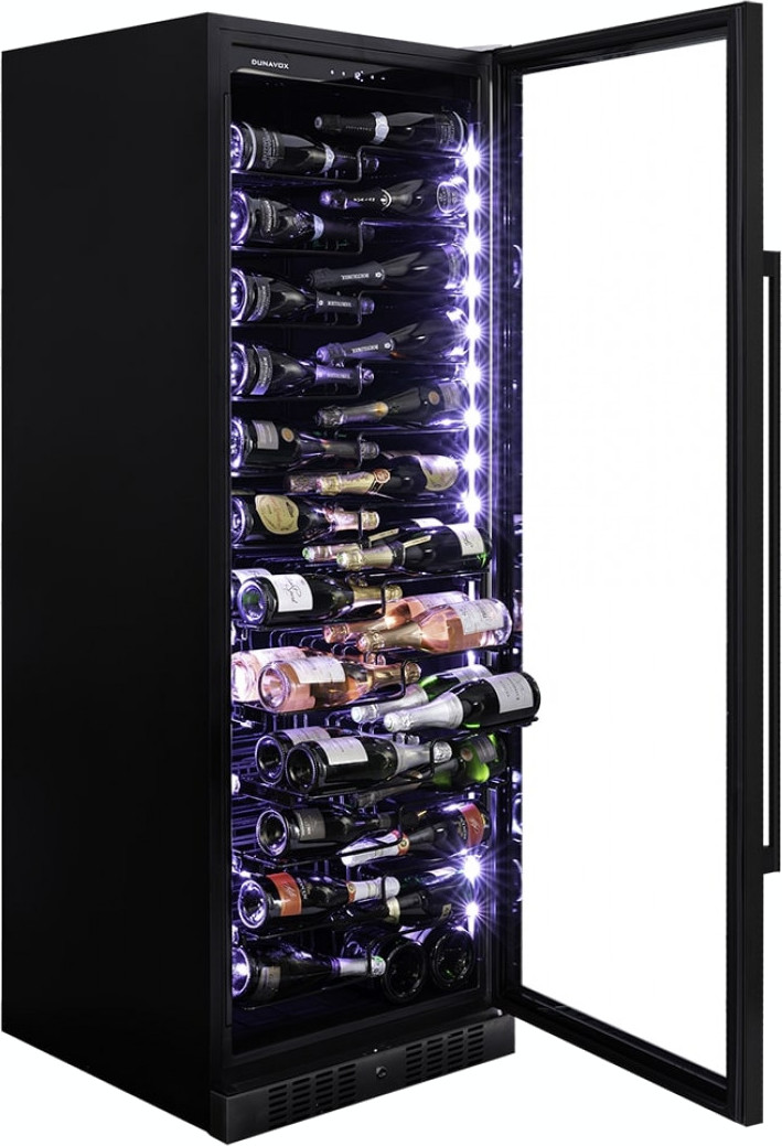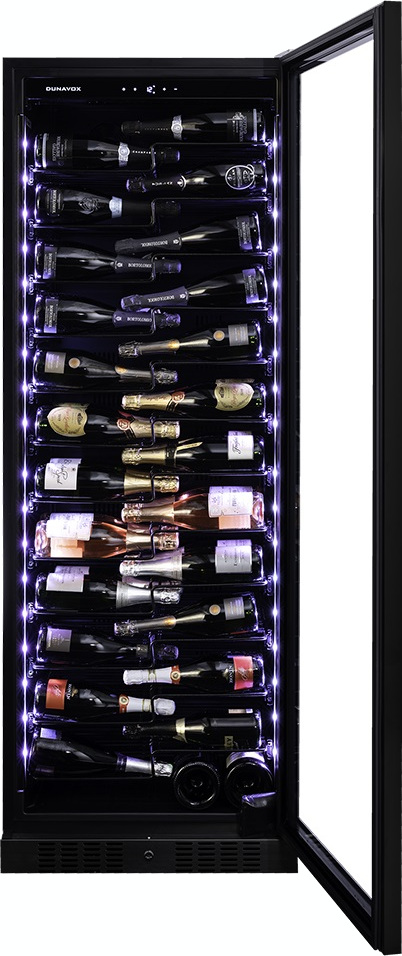Винный холодильник Dunavox DX-143.468MB имеет одну температурную зону, в которой можно разместить бутылки и единовременно выставить только одну комбинацию настроек. Он устанавливается отдельно, что удобно, если у вас есть специальное помещение — кладовая, погреб и т.д. Количество бутылок, которое можно разместить с учетом полной комплектации и из расчета объема бутылки 0,75 л, — 143 шт.