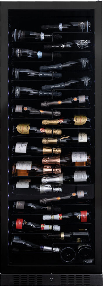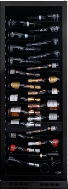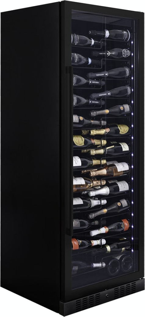Стеклянная дверь — дополнительный изящный штрих к общему дизайну модели. Специальное покрытие защищает вино от влияния ультрафиолетовых лучей, которые проникают, если шкаф находится в солнечной комнате. Хранение становится еще безопаснее и герметичнее благодаря нескольким слоям стекол. Цвет корпуса — черный матовый. Дверь можно перевесить на другую сторону, поэтому вариантов размещения его в доме становится больше.