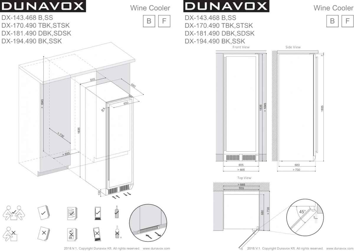 Некоторые отдельно стоящие винные шкафы, а также модели, встраиваемые в мебельную колонну, шкаф или другое закрытое пространство, оснащаются системой забора воздуха и вентиляционной решеткой, расположенными спереди в нижней части корпуса. Зазоры между корпусом шкафа и стенками мебели необходимы и в этом случае.