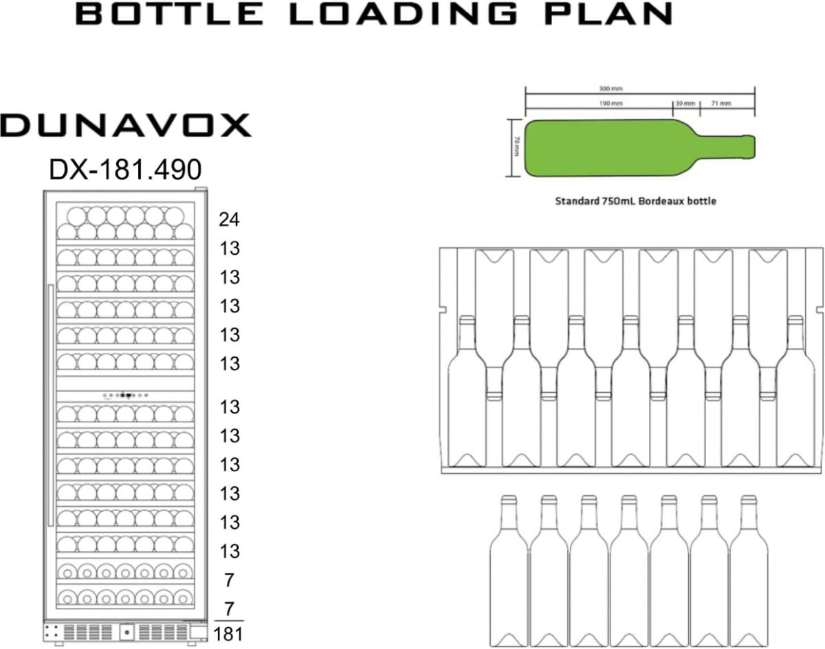 Винный холодильник Dunavox DX-181.490DMBK имеет две температурные зоны, в которых одновременно можно хранить разные сорта алкоголя и выставлять разные сочетания настроек. Он устанавливается отдельно, что удобно, если у вас есть специальное помещение — кладовая, погреб и т.д. Количество бутылок, которое можно разместить с учетом полной комплектации и из расчета объема бутылки 0,75 л, — 181 шт.