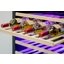 Дверца у большинства винных шкафов изготавливается из многослойного тонированного стекла. Такой материал, с одной стороны, позволяет оценивать коллекцию вин визуально, не открывая дверцу, в условиях стабильной температуры и влажности. С другой стороны, затемненное стекло с УФ-фильтром в виде напыления или специальной пленки надежно изолирует винные бутылки негативного воздействия ультрафиолетового излучения. Несколько слоев стекла обеспечивают при этом дополнительную защиту. Очень часто стекло в дверце заключается в рамку из дерева или металла. Натуральный или окрашенный металл или дерево не только способствуют прочности конструкции, но и превращают винный холодильник, особенно отдельно стоящий, в эффектный элемент обстановки.