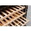 Полки в винных шкафах позволяют размещать бутылки для хранения в горизонтальном положении. Это необходимо, чтобы пробка постоянно смачивалась жидкостью и не пересыхала. Плотно закрытая пробка гарантирует, что внутрь бутылки не проникнет наружный воздух. Кислород, содержащийся в воздухе, может стать причиной ухудшения вкуса вина и даже его скисания. Кроме того, горизонтальное положение позволяет лучше оценить количество осадка. Материал изготовления полок выбирается, исходя из требований, предъявляемых к содержанию коллекции вин. Одним из основных требования является отсутствие или максимальное сокращение вибрации и хорошая фиксация бутылок на месте хранения. Даже если полка выдвигается, бутылки должны оставаться на своем месте. Второе требование исключает применение стеклянных полок, как в обычном холодильнике: на них почти невозможно зафиксировать бутылки.