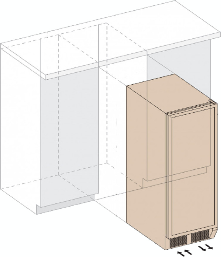 Некоторые отдельно стоящие винные шкафы, а также модели, встраиваемые в мебельную колонну, шкаф или другое закрытое пространство, оснащаются системой забора воздуха и вентиляционной решеткой, расположенными спереди в нижней части корпуса. Зазоры между корпусом шкафа и стенками мебели необходимы и в этом случае.