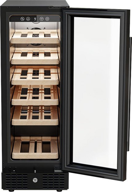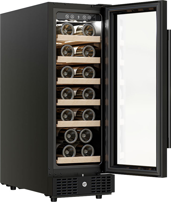 Встраиваемые холодильники для вина оснащаются специальной системой вентиляции: охлаждающая система у них находится в нижней части корпуса спереди. На такие устройства не навешивается мебельный фасад: дверца с затемненным стеклом остается на виду и открывается на достаточно широкий угол для свободного выдвижения деревянных полок.