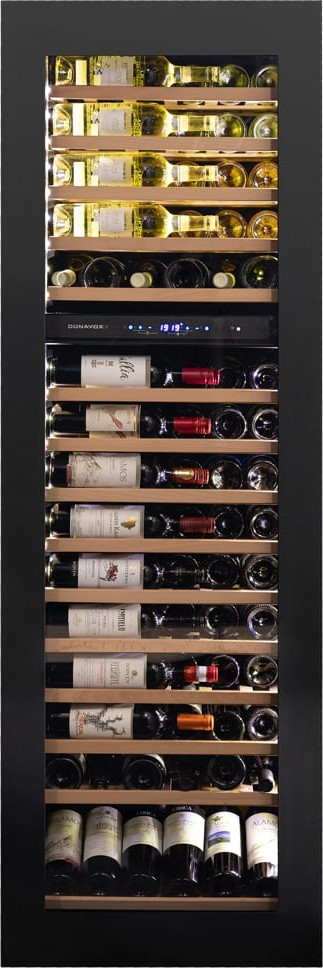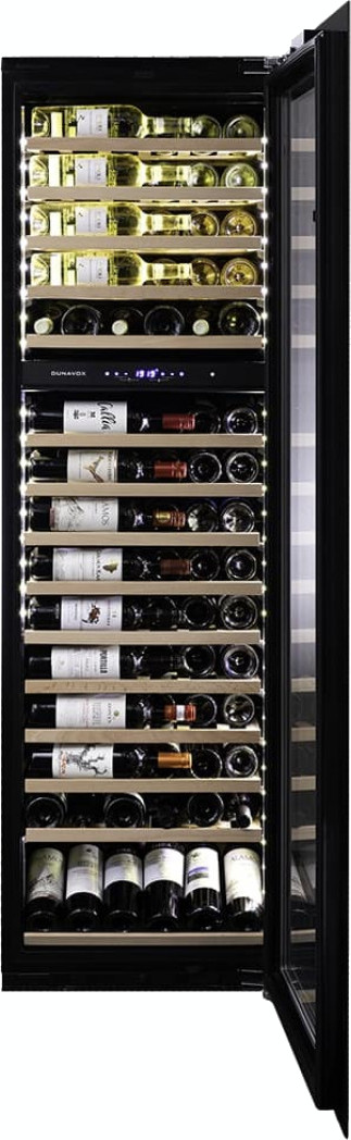 Винный холодильник Dunavox DAVG-114.288DMB.TO имеет две температурные зоны, в которых одновременно можно хранить разные сорта алкоголя и выставлять разные сочетания настроек. Он встраивается в нишу, что удобно, если у вас ограничен метраж помещения. Количество бутылок, которое можно разместить с учетом полной комплектации и из расчета объема бутылки 0,75 л, — 114 шт.