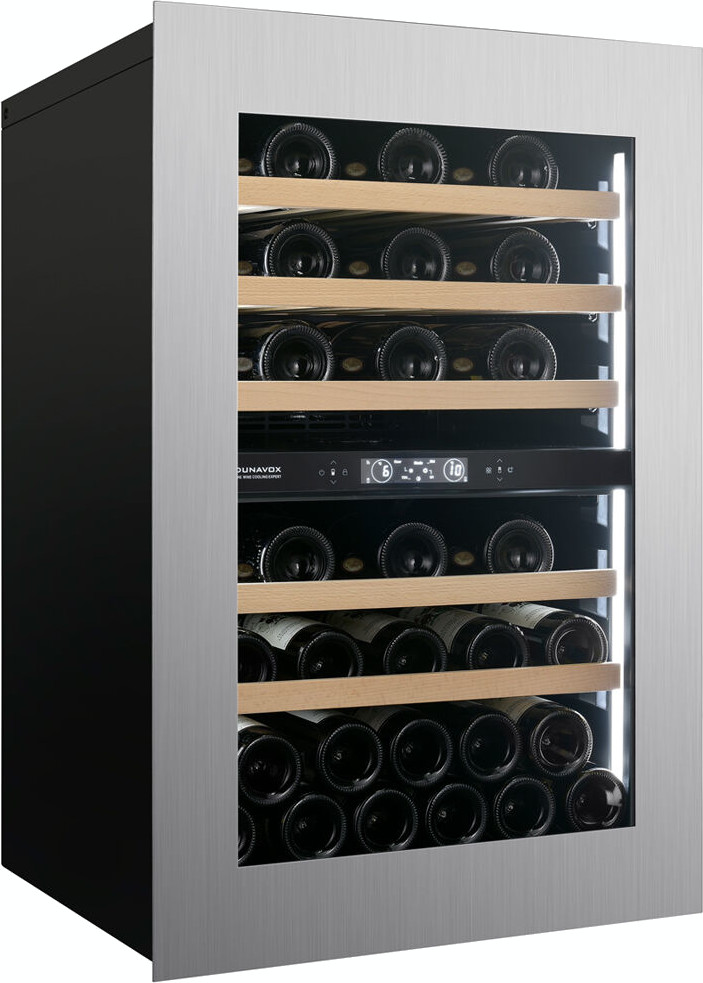 Винный холодильник Dunavox DVH-44.120DC.TO имеет две температурные зоны, в которых одновременно можно хранить разные сорта алкоголя и выставлять разные сочетания настроек. Он встраивается в нишу, что удобно, если у вас ограничен метраж помещения. Благодаря компактным размерам данная модель — отличный выбор для офиса, гостиничного номера. Количество бутылок, которое можно разместить с учетом полной комплектации и из расчета объема бутылки 0,75 л, — 44 шт.