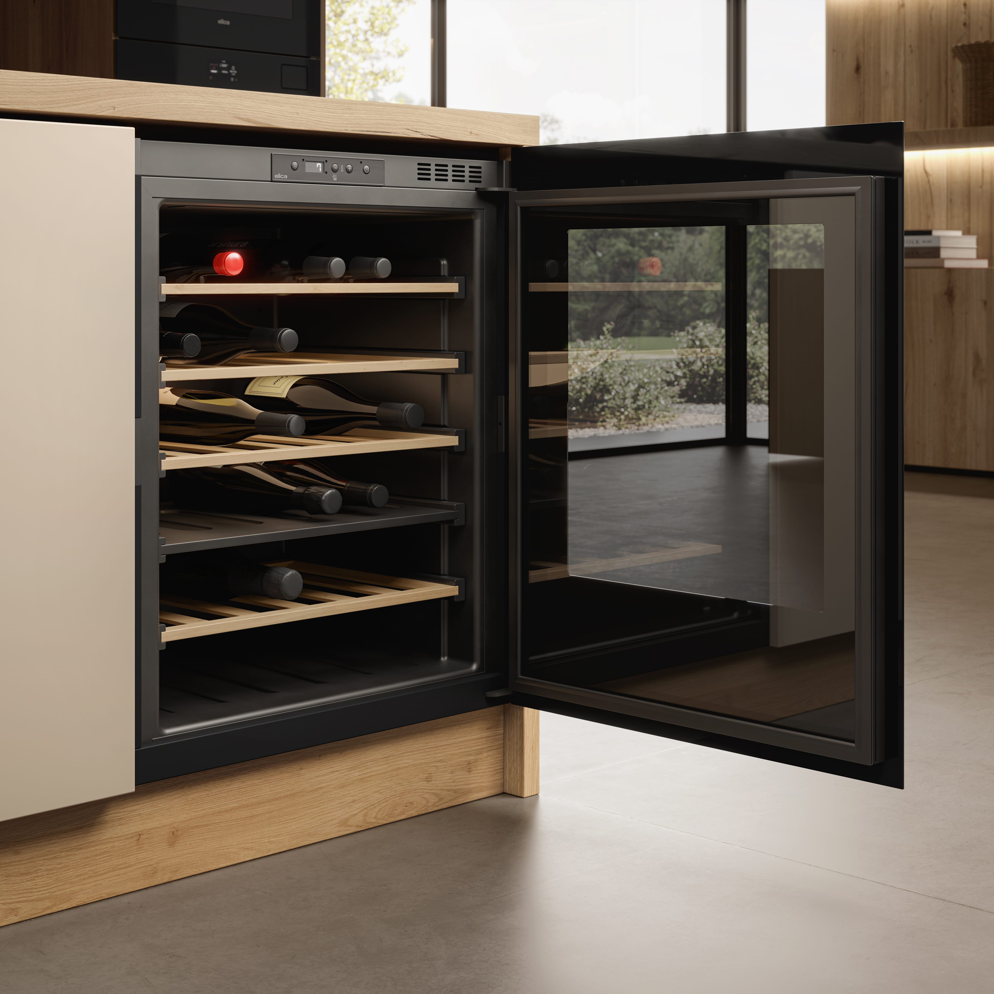 Стеклянная дверца винного шкафа — опция, которая решает сразу несколько задач. Прежде всего, она обеспечивает хороший обзор, позволяет контролировать коллекцию и демонстрировать ее, не открывая дверцу и не нарушая температурный режим. Стекло не только позволяет изолировать вино от наружного воздуха, но и не пропускает посторонние запахи. Прямые солнечные лучи также отрицательно влияют на качество вина, вызывая окисление танина — соединения, которое в нем содержится, и напиток становится горьким. Стеклянные дверцы снабжаются фильтрами или покрытием, защищающим бутылки по ультрафиолета. Способы защиты могут быть самыми разными — от наклеенной пленки до специального напыления. Иногда в дверцу устанавливается зеркальное стекло, в других случаях на него наносят тонировку в технике шелкографии.