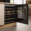 Встраиваемые холодильники для вина оснащаются специальной системой вентиляции: охлаждающая система у них находится в нижней части корпуса спереди. На такие устройства не навешивается мебельный фасад: дверца с затемненным стеклом остается на виду и открывается на достаточно широкий угол для свободного выдвижения деревянных полок.