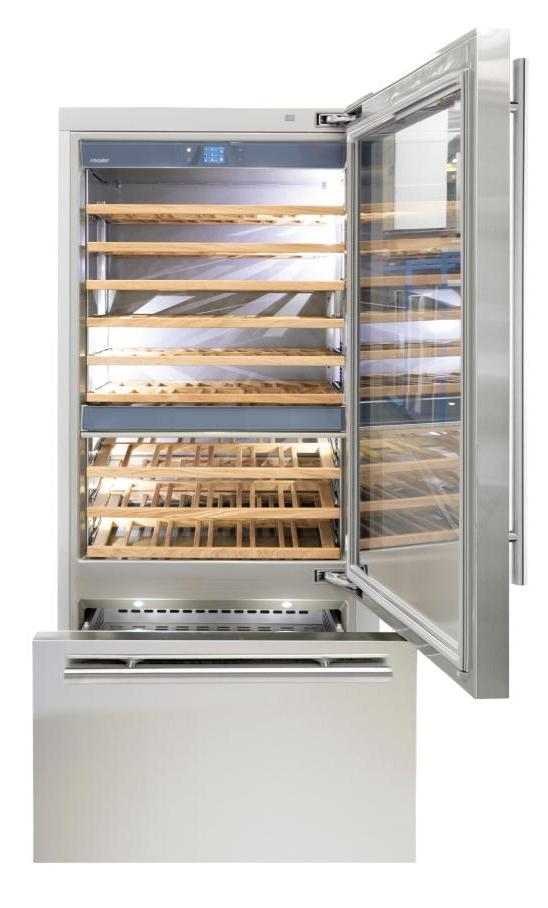 Винный холодильник Fhiaba KS901TWT6 имеет несколько температурных зон, в которых одновременно можно хранить разные сорта алкоголя и выставлять разные сочетания настроек. Он встраивается в нишу, что удобно, если у вас ограничен метраж помещения. Количество бутылок, которое можно разместить с учетом полной комплектации и из расчета объема бутылки 0,75 л, — 108 шт.