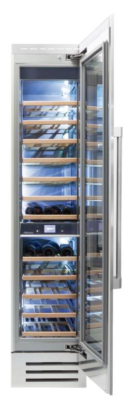 Электронное управление помогает быстро разобраться в том, как функционирует эта модель, и легко настроить все необходимые параметры. На дисплее отображаются данные, которые собирают датчики в камере. Лампочки, расположенные внутри, хорошо подсвечивают бутылки. Всего полок, на которых можно разместить коллекцию, в шкафу 13 шт.