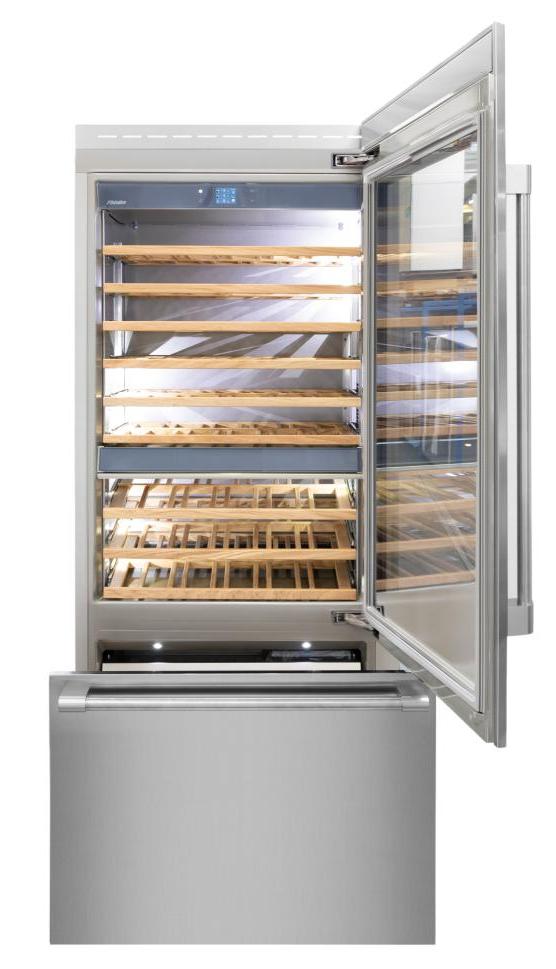Винный холодильник Fhiaba RS901TWT6 имеет несколько температурных зон, в которых одновременно можно хранить разные сорта алкоголя и выставлять разные сочетания настроек. Он встраивается в нишу, что удобно, если у вас ограничен метраж помещения. Количество бутылок, которое можно разместить с учетом полной комплектации и из расчета объема бутылки 0,75 л, — 108 шт.