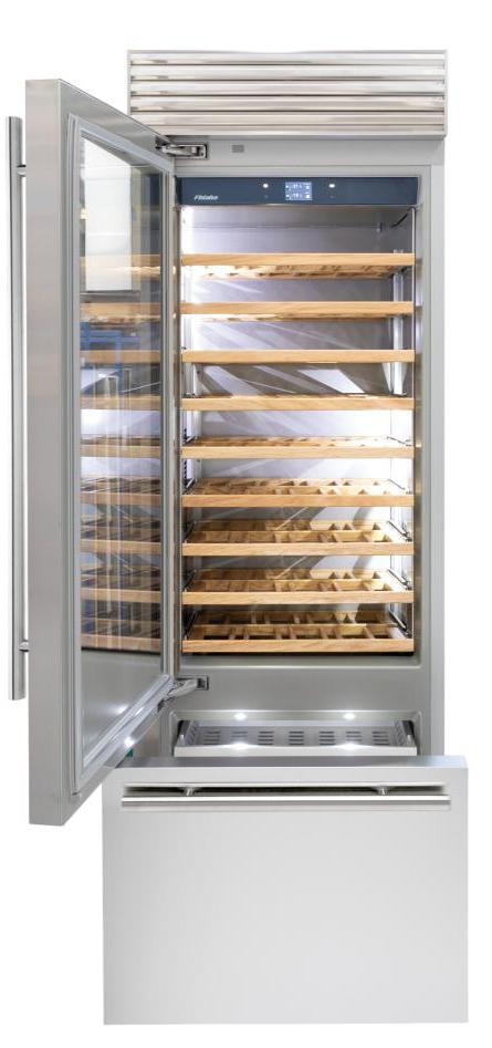 Винный холодильник Fhiaba XS750TWT3 имеет две температурные зоны, в которых одновременно можно хранить разные сорта алкоголя и выставлять разные сочетания настроек. Он встраивается в нишу, что удобно, если у вас ограничен метраж помещения. Количество бутылок, которое можно разместить с учетом полной комплектации и из расчета объема бутылки 0,75 л, — 81 шт.