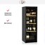 Четыре полки выполнены из дерева, оно считается наиболее подходящим для винных шкафов, на них вы можете расположить в вертикальном положении до 165 бутылок типа бордо по 0.75 л. Стеклянная дверца позволяет показывать коллекцию, не заглядывая вовнутрь. Светодиодная подсветка выставит вина в наилучшем свете при их демонстрации. Единый температурный режим подходит для одного сорта вин, можно установить от +5 до +18 градусов. Внутренняя вентиляция распределяет воздушный поток для равномерного охлаждения камеры.