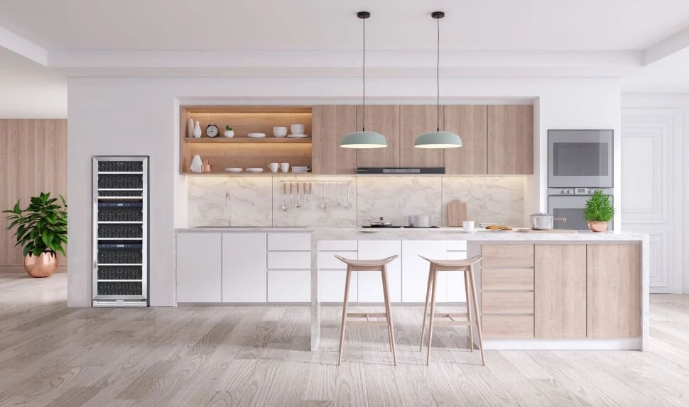 По типу размещения винные шкафы делятся на две группы: отдельно стоящие и встраиваемые. В связи со спецификой этого оборудования установка с том и в другом случае имеет свои особенности. Общие принципы заключаются в том, что рядом с ними нельзя располагать нагревательные приборы — такие, как варочная панель или духовой шкаф. Винные холодильники не должны устанавливаться в зоне попадания прямых солнечных лучей. Также не допускается хранение рядом сильно пахнущих продуктов — например, кофе или рыбы.