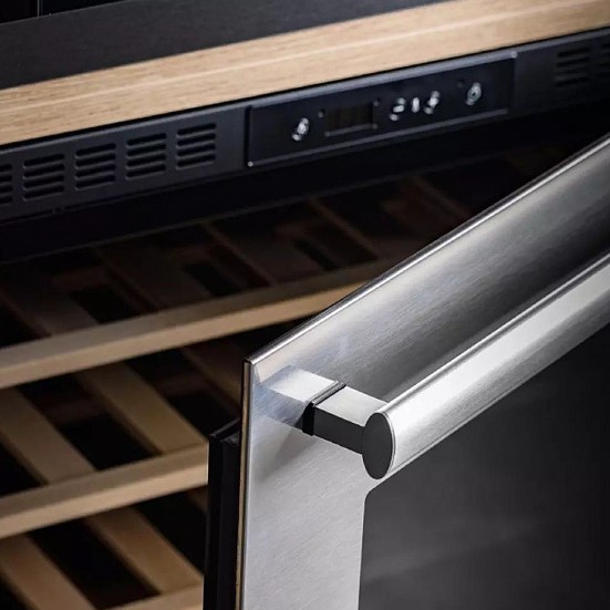 Расположение дверного упора у винных шкафов определяется не только особенностями модели, но и типом дверцы, а также возможностью встраивания. У самых распространенных винных холодильников с навесной дверцей такой упор может располагаться как слева, так и справа: у большинства моделей имеется возможность перенавешивания дверцы. Такая опция особенно удобна, если предполагается установка шкафа side-by-side с другим холодильником. Отдельно следует рассмотреть небольшие винные шкафы с откидной дверцей, которые могут встраиваться в колонну. У них дверной упор располагается снизу.