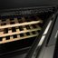 Встраиваемые холодильники для вина оснащаются специальной системой вентиляции: охлаждающая система у них находится в нижней части корпуса спереди. На такие устройства не навешивается мебельный фасад: дверца с затемненным стеклом остается на виду и открывается на достаточно широкий угол для свободного выдвижения деревянных полок.