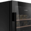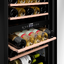 Внутри располагаются четыре полки из бука, рассчитанные на 28 бутылок по 0,75 л и полезный объём около 80 литров. Деревянные рейки мягко фиксируют бутылки и предохраняют этикетки от повреждений, а натуральная текстура дерева придаёт интерьеру уют. Светодиодное освещение равномерно подсвечивает полки и не нагревает содержимое, что важно для сохранения аромата и вкуса напитков. Встроенная вентиляция обеспечивает циркуляцию воздуха и выравнивание климата внутри, минимизируя температурные перепады между полками.
