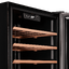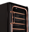 Внутреннее пространство рассчитано на 34 бутылки по 0,75 л и полезный объем 85 литров. Шесть выдвижных полок из бука аккуратно поддерживают бутылки и уменьшают вибрации при контакте с поверхностью. Дерево не только декоративно выглядит, но и мягче относится к этикеткам и пробкам по сравнению с металлическими полками. Встроенное светодиодное освещение равномерно подсвечивает содержимое и экономит энергию, не нарушая микроклимата.