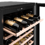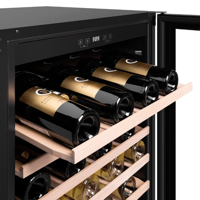 Этот шкаф монотемпературный и рассчитан на хранение бутылок одного диапазона температур. Полезный объём 135 литров компенсирован грамотной планировкой пяти деревянных полок из бука. Дерево бережно удерживает стеклянные бутылки, снижает риск скольжения и обеспечивает эстетичную подачу коллекции. Вместимость до 54 бутылок по 0,75 л позволяет разместить разнообразную подборку от молодых до выдержанных вин.
