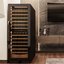Встраиваемые холодильники для вина оснащаются специальной системой вентиляции: охлаждающая система у них находится в нижней части корпуса спереди. На такие устройства не навешивается мебельный фасад: дверца с затемненным стеклом остается на виду и открывается на достаточно широкий угол для свободного выдвижения деревянных полок.