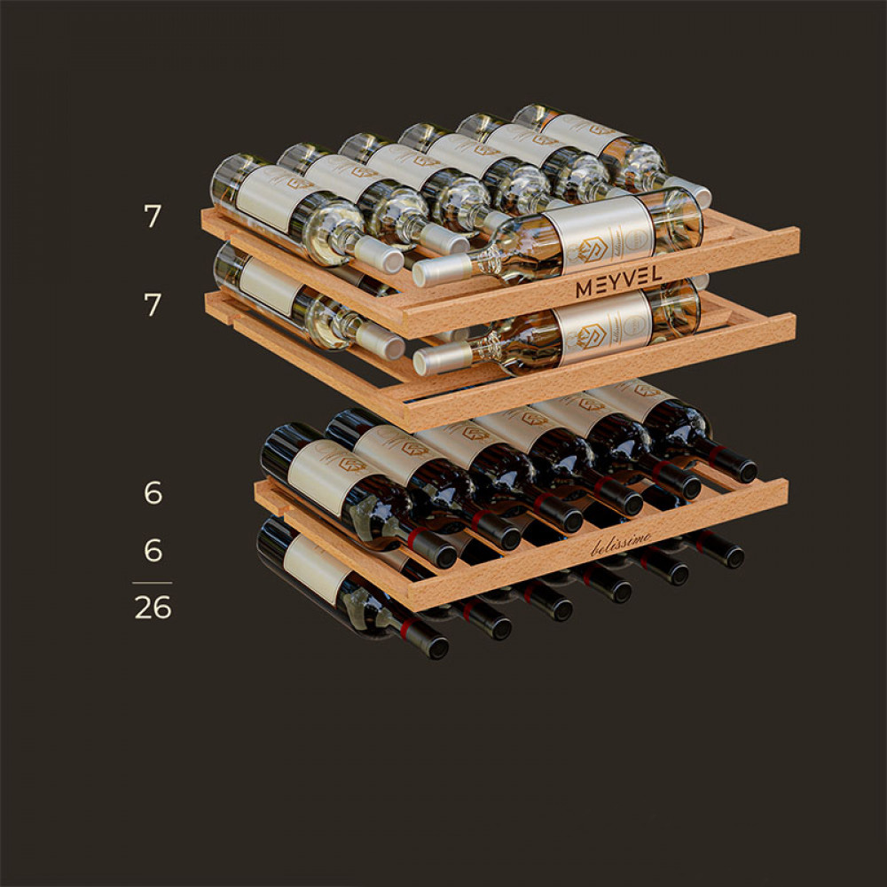 Винный холодильник Meyvel MV26PRO-KBB2 имеет две температурные зоны, в которых одновременно можно хранить разные сорта алкоголя и выставлять разные сочетания настроек. Он встраивается в нишу, что удобно, если у вас ограничен метраж помещения. Благодаря компактным размерам данная модель — отличный выбор для офиса, гостиничного номера. Количество бутылок, которое можно разместить с учетом полной комплектации и из расчета объема бутылки 0,75 л, — 26 шт.