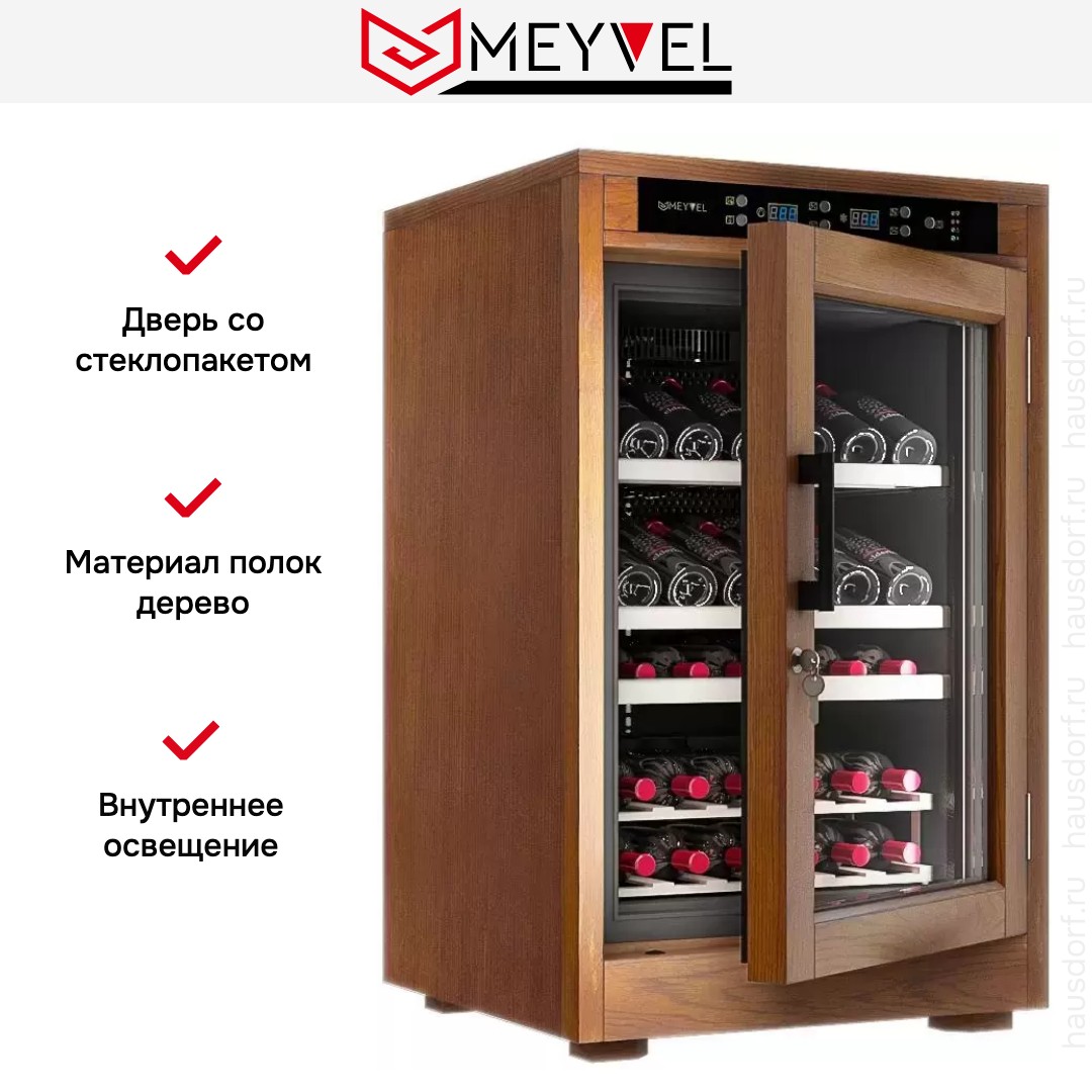 Для длительного сохранения установленных параметров в винных шкафах Meyvel используется дверца с многослойным остеклением. Такое решение позволяет удерживать холод внутри камеры вне зависимости от температуры в помещении, а также сохранить температуру при отключении электроэнергии.