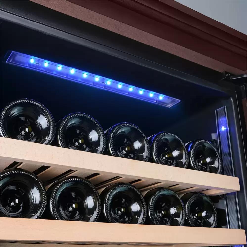 Кнопки для управления подсветкой выносятся на панель управления. Лампы синего, белого или голубого цветов могут располагаться в верхней части камеры или на боковых сторонах. Дополнительное освещение может устанавливаться в винных холодильниках с зоной для сервировки: она обеспечивает лучший обзор и доступ при подготовке вина к подаче.