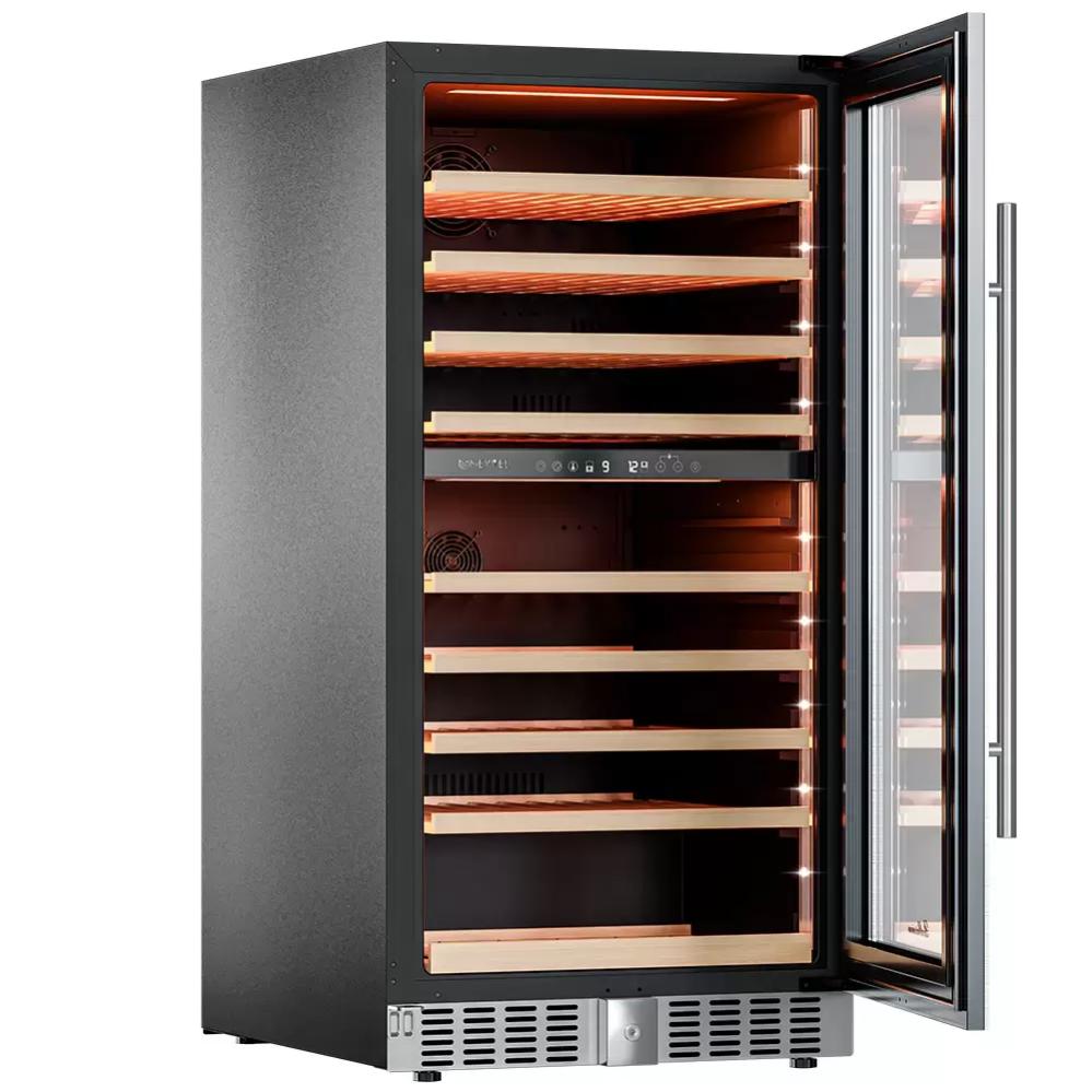 Производители предлагают винные шкафы, оснащенные одной, двумя, тремя и четырьмя камерами, которые могут располагаться как друг под другом, так бок и бок. Самые популярные — однокамерные модели, ассортимент которых особенно широк, но втором месте — двухкамерные. Над заметить, что количество камер не зависит напрямую от габаритов изделия: например, однокамерные модели увеличенных габаритов — далеко не редкость. Их высота может варьироваться в пределах от 14 см до 219 см, а ширина — от 13 см до 150 см.
