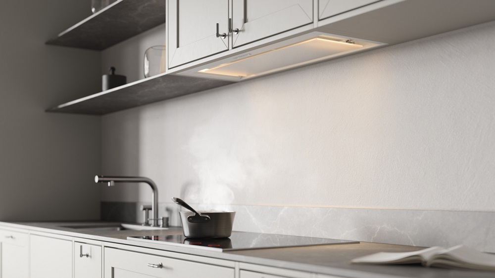 Встраивание вытяжки в шкаф — оптимальный вариант для малогабаритной кухни. Такие модели просты в установке, недороги, практически скрыты от глаз, их не нужно подбирать по внешнему виду, а также чем-то маскировать воздуховод. Уровень шума также снижается благодаря дополнительной звукоизоляции. Встроенные в шкаф модели могут дополняться выдвижной панелью, которая увеличивает площадь забора загрязненного воздуха. Иногда к встраиваемым относят также вытяжки, которые монтируются под подвесной шкаф, хотя их корпус остается на виду.