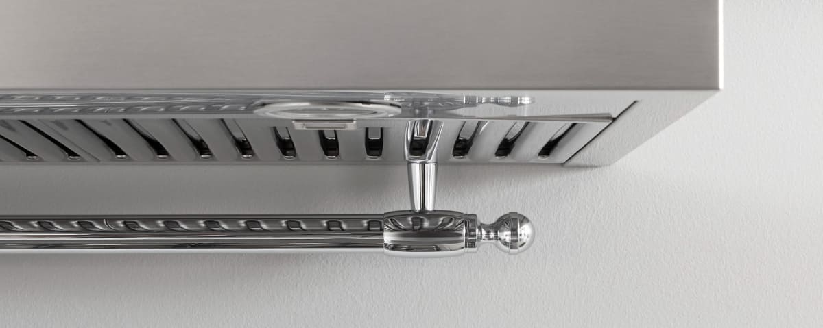 Часто кнопки или слайдеры находятся на фронтальной части устройства с правой стороны, чтобы их было удобнее переключать правой рукой и бывают скрыты выдвижным экраном. В больших купольных моделях кнопки специально выполняются так, чтобы бросаться в глаза: это заметная часть отделки устройства. Так, медные или латунные кнопки на светлом фасаде подчеркивают классический дизайн вытяжки и гармонируют с окантовкой из металла или натурального дерева. В таких моделях обычные кнопки или слайдеры могут заменяться более стильными поворотными переключателями.