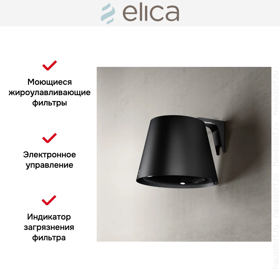 Данная вытяжка выглядит изящной и невесомой за счет свободного пространства между креплением и основным корпусом. Обратите внимание на цветовые сочетания модели Elica EASY UX BL MAT/F/50, чтобы органично вписать ее в свою квартиру. Оттенок корпуса: черный. Благодаря лампочкам, которые расположены на нем, можно освещать плиту и столешницу рядом, чтобы готовить было еще проще и приятнее.