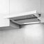 В этой модели есть три разных режима скорости работы. Вытяжка работает в режиме отвода и рециркуляции: воздух очищается от частиц масла, а после возвращается на кухню через верхнюю решетку устройства. Размер воздуховода составляет 120 мм. На электронной панели кнопочные элементы управления устройством расположены по бокам корпуса.