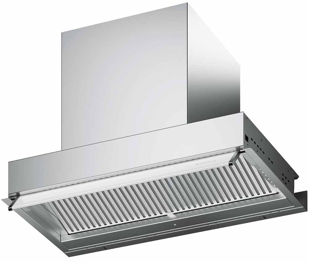 Вытяжки, встраиваемые в столешницу — эффективная инновация, которая подойдет для установки в кухне любой площади. Такие вытяжки размещаются за варочной поверхностью или рядом с ней. В отключенном состоянии всасывающая панель находится под столешницей, но после включения одной или нескольких конфорок она автоматически выдвигается при помощи специального лифтового механизма. Загрязненный воздух улавливается, не успевая распространиться по помещению. Когда вытяжка убрана, на виду остается только сенсорная панель управления. Недостатком подобных моделей является только сравнительно высокая цена.