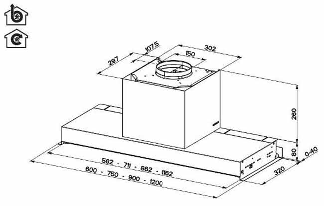 У многих встраиваемых моделей глубина может регулироваться, а рабочая всасывающая поверхность — увеличиваться благодаря выдвижному козырьку, но габариты корпуса такой вытяжки должны соответствовать размерам подвесного шкафа. Выбирать основные размеры вытяжки с соблюдением всех требований эффективности и безопасности работы следует также не в ущерб общему дизайну помещения.