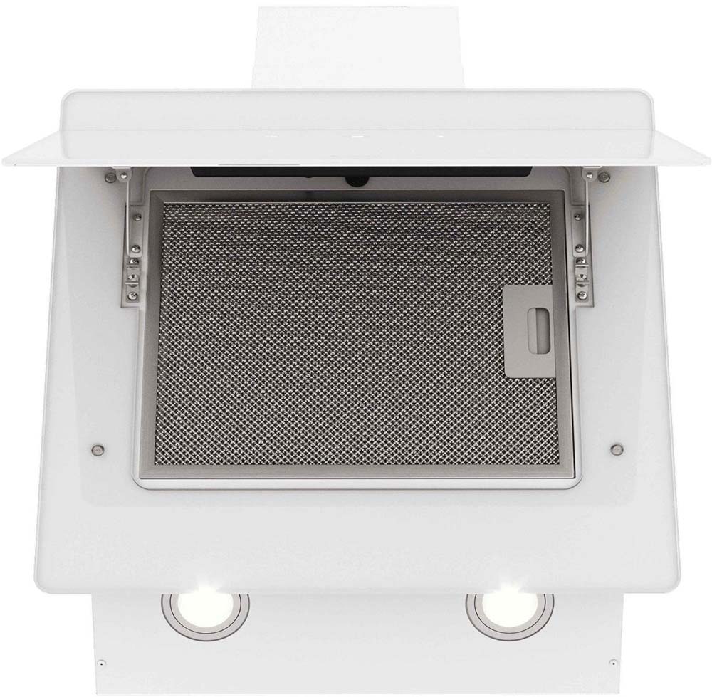 Воздух всасывается по периметру вытяжки через узкие щели. Он собирается в потоки, которые направляются прямо к фильтрам внутри, не рассеивается на кухне. Благодаря этой технологией вытяжку можно сделать компактнее и энергоэффективнее.