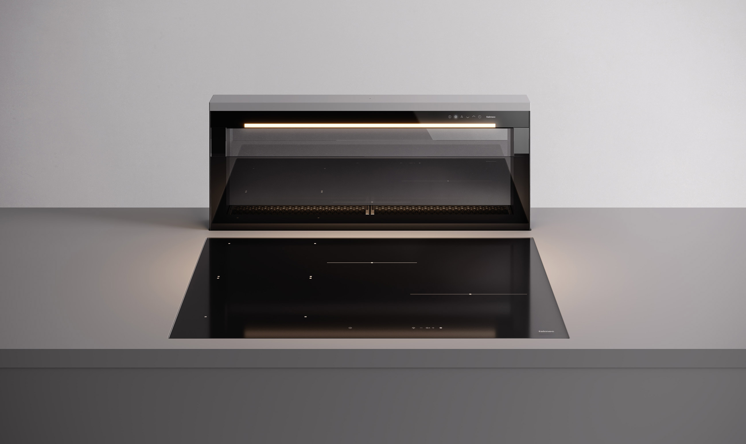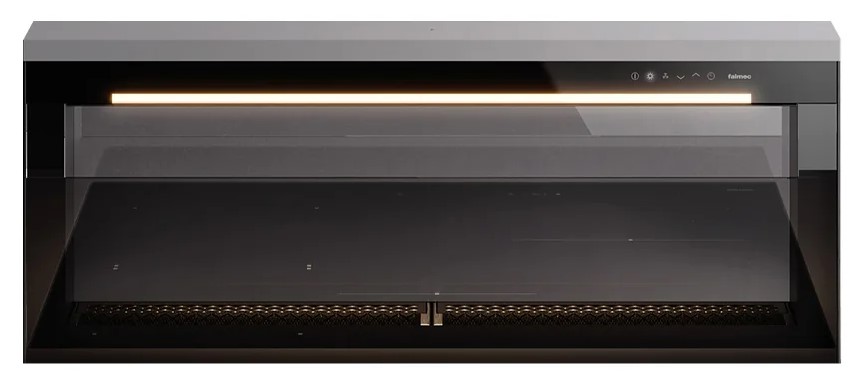 В вытяжках, интегрированных в варочную поверхность и работающих в режиме рециркуляции, панель выдвигается при включении зоны нагрева автоматически. В закрытом же состоянии видны только сенсорные управляющие элементы, которые находятся вровень с варочной поверхностью.